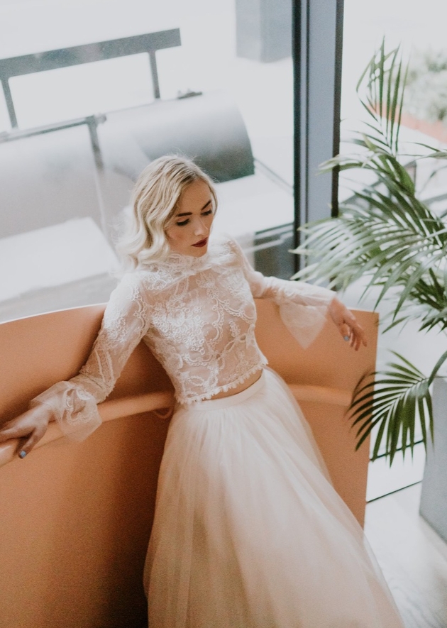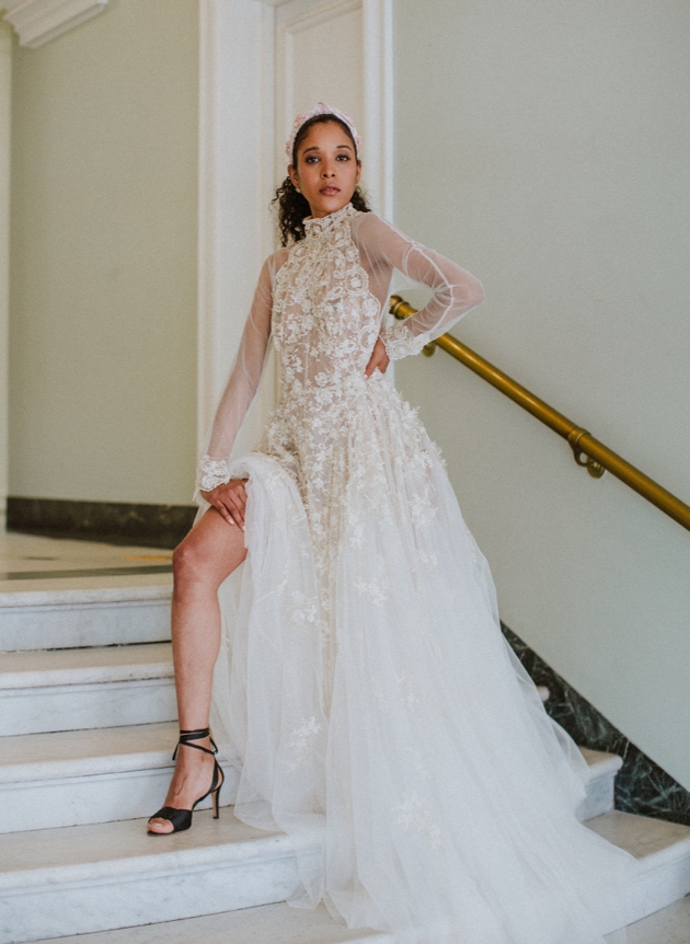 model in nude bodice with lace overlay, sleeved top with high neck and hair piece