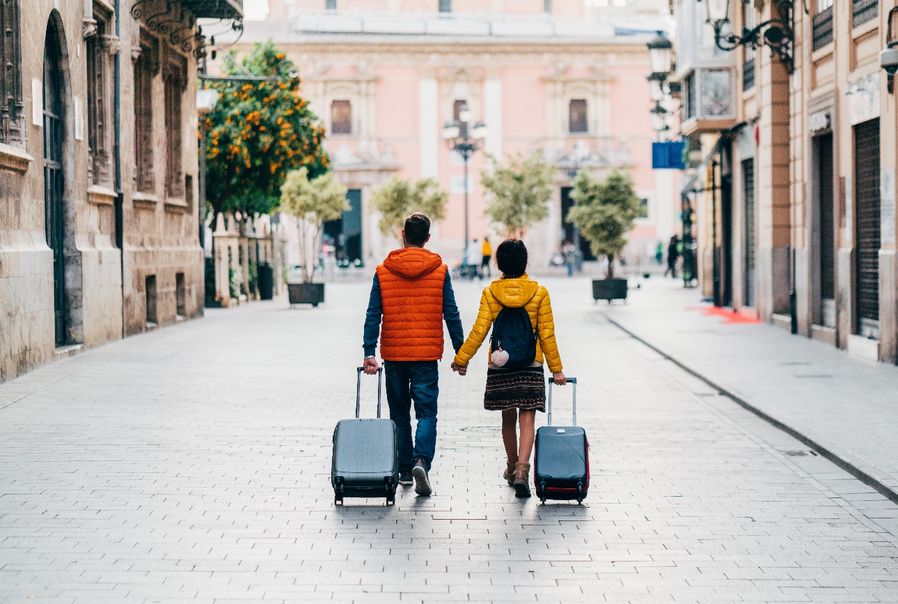 couple walking through foreign city with suitcases