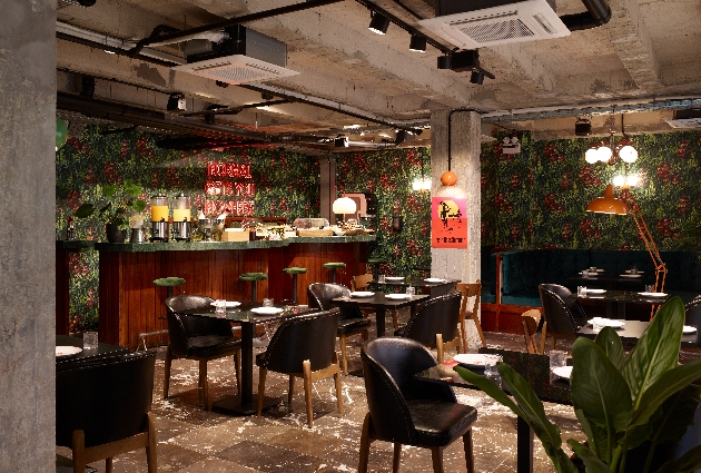 concrete pillars and expose industrial ceiling, jungle wallpaper, bar with table sand chairs