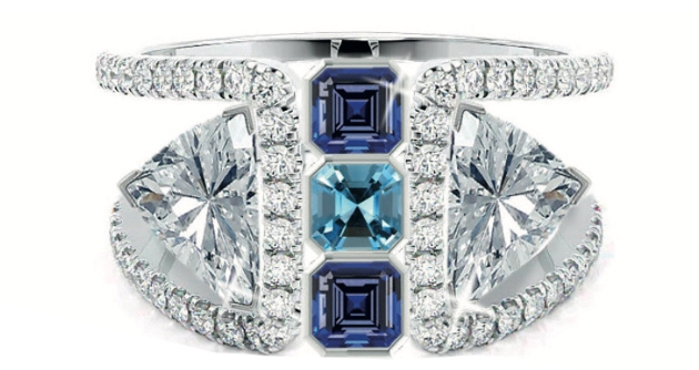 In the spirit of the World Cup, Lily Arkwright has designed a completely bespoke ring. This one-off design has taken inspiration from the women’s away kit, using deep blues of lab-grown sapphires and the lighter blue colours of an aqua spinel.